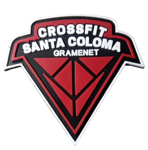 Este parche de goma CrossFit Santa Coloma Gramenet está fabricado en PVC flexible de alta resistencia, pensado para soportar entrenamientos exigentes y condiciones de uso intensivo. Su diseño en forma de escudo invertido combina colores rojo, negro y blanco, ofreciendo un acabado moderno, llamativo y fácilmente reconocible.